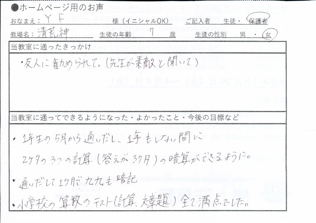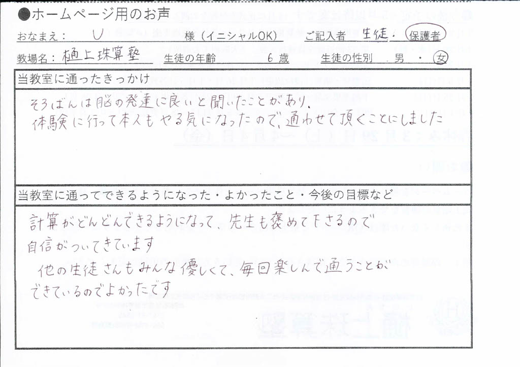 計算力・集中力を身につけてほしくて、そろばんを習ってほしいと思っていました。体験に行ってみると先生の教え方と声かけが子供にとても合っていたのですぐに入塾することにしました。